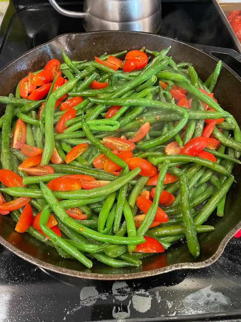 - Once green beans start to soften, about 10-15 mins, add in the tomato halves.